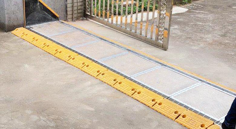 无水时,挡水板伏卧在地面框体上。车辆可以正常通行。